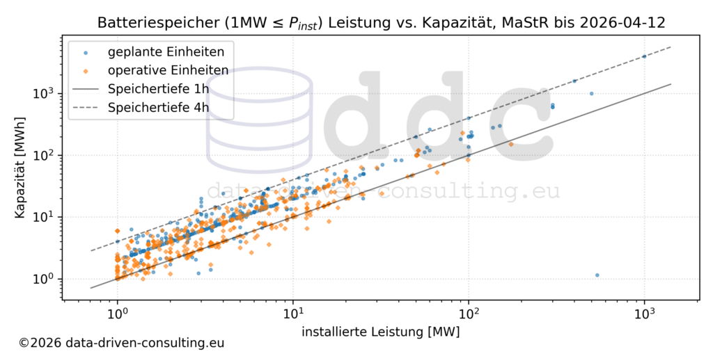 Die meisten operativen BESS (oben in orange) decken einen Leistungsbereich von 1 (100) bis über 100 (102) MW ab und liegen in Bezug auf die Speichertiefe bei unterhalb einer Stunde bis hin zu 6h, wobei die meisten Systeme im Bereich zwischen 1h und 4h liegen. Die geplanten BESS (oben in blau dargestellt) beginnen auf Grund der Filterregel für den Auszug aus dem MaStR auch bei 1MW und reichen aber nach oben bis zu 1.000 (103) MW. Auffällig ist, dass bei den geplanten Systemen nur wenige unterhalb der 1h-Diagonale liegen und sich sehr viele Systeme sich bei einer Speichertiefe von 2h konzentrieren.