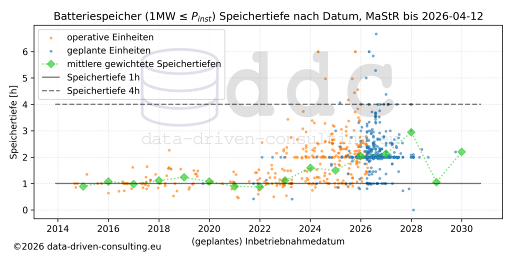Betrachtet man die Speichertiefen in Abhängigkeit des (geplanten) Inbetriebnahmedatums, dann ist auch hier eine Häufung für geplante BESS mit 2h Speichertiefe zu erkennen. Die Entwicklung der gewichteten Speichertiefe eines Jahrgangs liegt bis 2023 mehr oder weniger um 1h und steigt dann bereits in 2026 auf 2h an, wobei hier geplante und operative Systeme jeweils zusammen gerechnet werden. Im Ausblick nach 2027 steigt dann die gewichtete Speichertiefe auf 3h an und fällt dann für die Folgejahre aber wieder ab. Hierbei ist aber zu berücksichtigen dass hier erst wenige Systeme im MaStR eingepflegt sind und die Angaben sich bis zur realen Inbetriebnahme auch noch ändern können.