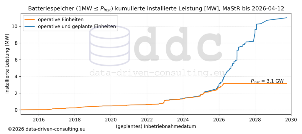 Die aktuelle und die auf Basis der aktuellen Meldungen im MaStR kumulierten installierten Leistung erreicht zur Zeit ein Niveau von etwas über 3 GW, wobei hier wie oben beschrieben nur BESS mit mehr als 1MW installierter Leistung berücksichtigt sind. Die bereits gemeldeten Systeme kommen zusammen auf eine Leistung von deutlich über 10 GW bis 2030, wobei diese Zahlen nur eine Momentaufnahme darstellen, da im MaStR wahrscheinlich nur solche BESS-Projekte eingetragen werden deren Umsetzung eher wahrscheinlich ist. Die Abbildung für die nutzbare Speicherkapazität zeigt einen ganz ähnlichen Verlauf und erreicht ausgehend vom aktuellen Niveau bei 5 GWh bis 2030 ca. 24 GWh.