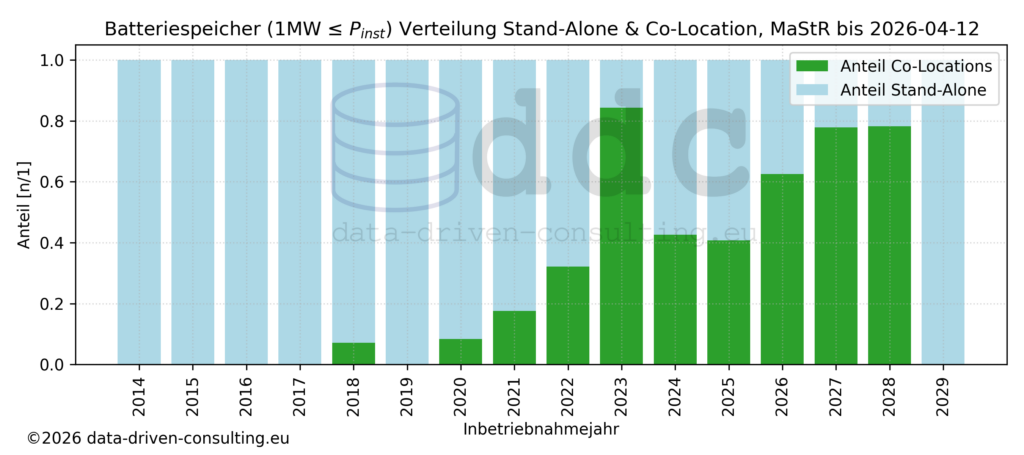 Analysiert man im MaStR, ob BESS als reine Speicherprojekte “Stand-Alone” oder in Verbindung mit einer erneuerbaren Energieanlage als “Co-Location” betrieben oder geplant werden, erkennt man dass es hier seit 2020 einen stetigen Trend zur Co-Location gibt. Umgekehrt ist es in der Branche schon länger common sense, das z.B. PV-Freiflächenanlagen wirtschaftlich nur noch mit Batteriespeichern geplant und errichtet werden um Vergütungsausfälle bei negativen Preisen zu vermeiden. Es gilt aber offensichtlich der umgekehrte Zusammenhang, dass Batteriespeicher in zunehmendem Maße in Verbindung mit erneuerbaren Energieanlagen geplant und gebaut werden. Dieser Trend scheint sich voraussichtlich in den kommenden Jahren noch verstärken und wird auf Basis der aktuell als geplant gemeldeten Projekte dazu führen, dass ab 2027 über drei viertel der Systeme als Co-Location gebaut werden.