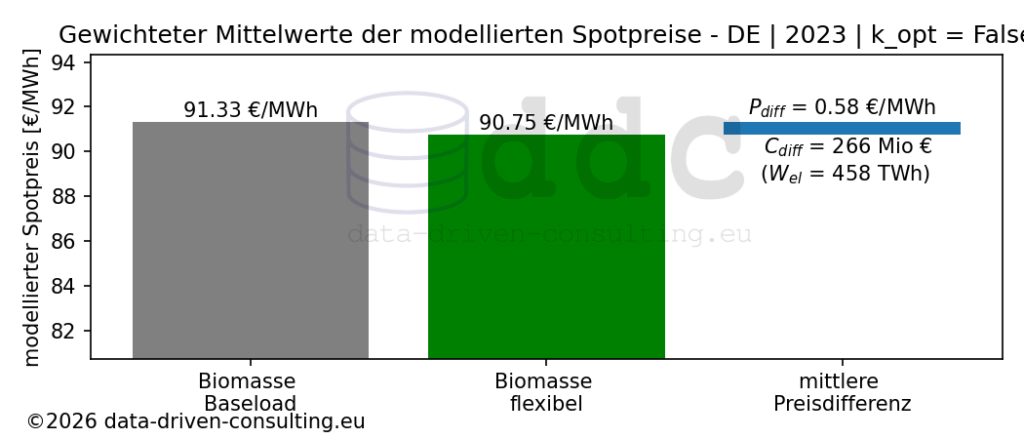 Die ermittelte mengengewichtete Preisdifferenz zwischen beiden Szenarien beträgt zwar nur 0,58 €/MWh, allerdings ergeben sich daraus Einspareffekte von insgesamt 266 Mio € als Kosumentenrente für die Strombeschaffung. Auch für die Berechnung der Einsparungen wurde stundenscharf die jeweilige Preisdifferenz mit dem Strombedarf gewichtet. Auch wenn das Modell sehr stark vereinfacht ist und die Marktkoppellung zu den mit Deutschland im Austausch stehenden Europäischen Gebotszonen der Nachbarländer nicht berücksichtigt ist, demonstriert der Ansatz das selbst die 2023 noch vergleichsweise unflexible Fahrweise des Deutschen Bioenergieanlagenportfolios einen signifikanten Beitrag zur Preisdämpfung leisten kann.